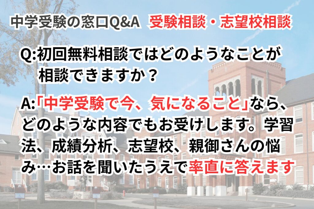 A:受験に関することなら、どのようなことでもお受けします。学習の進め方、中学受験での悩みや迷い、伴走する上での注意点、などお話をうかがい「中学受験の窓口」としての考え方をお伝えします。セカンドオピニオン(第2の意見)としてもご利用ください。