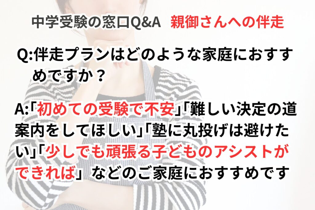 中受は子ども以上に親が不安で押しつぶされそうになります。「寄り添いプラン」は親子の「心のサポート」、塾との関わり方や声がけの仕方、「話を聞いてほしい」に親としても中受を伴走した専門家が寄り添います。 面談は対面かオンラインで2週に1度、LINE相談は随時。「ひとりで抱え込まない受験」にします。