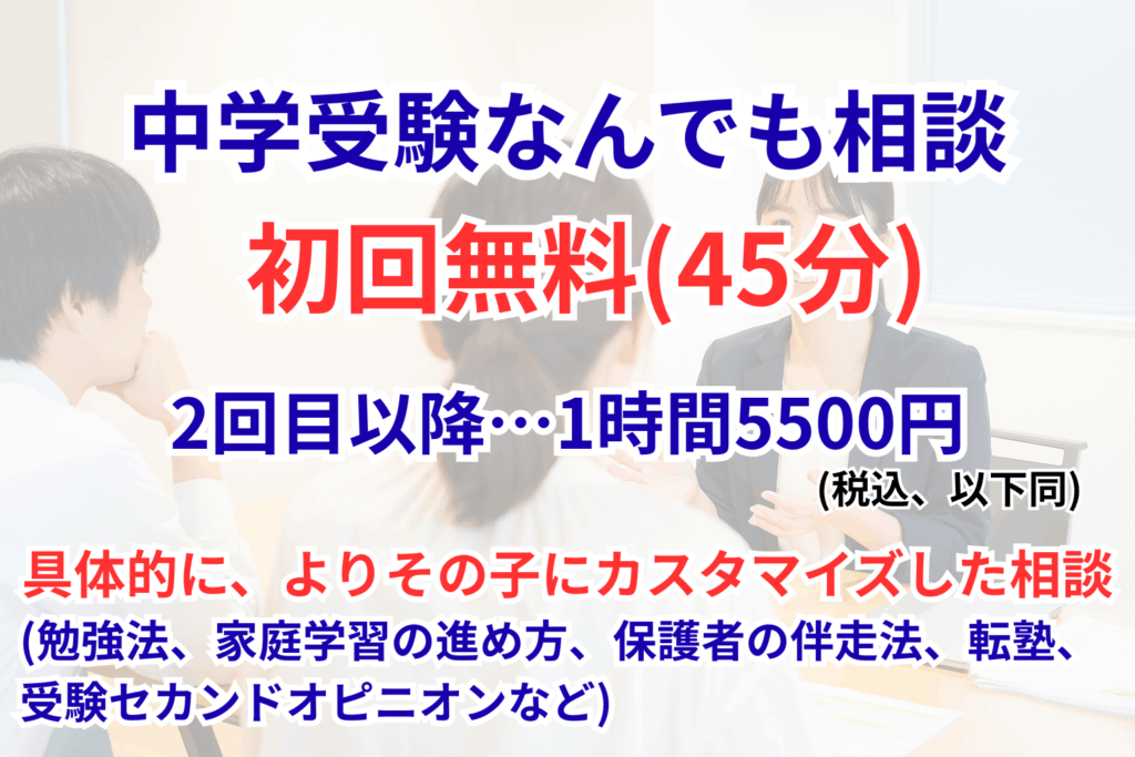 中学受験について聞きづらいお悩みや不安がある方は、下のご案内(無料相談・料金など)もあわせてご覧ください。